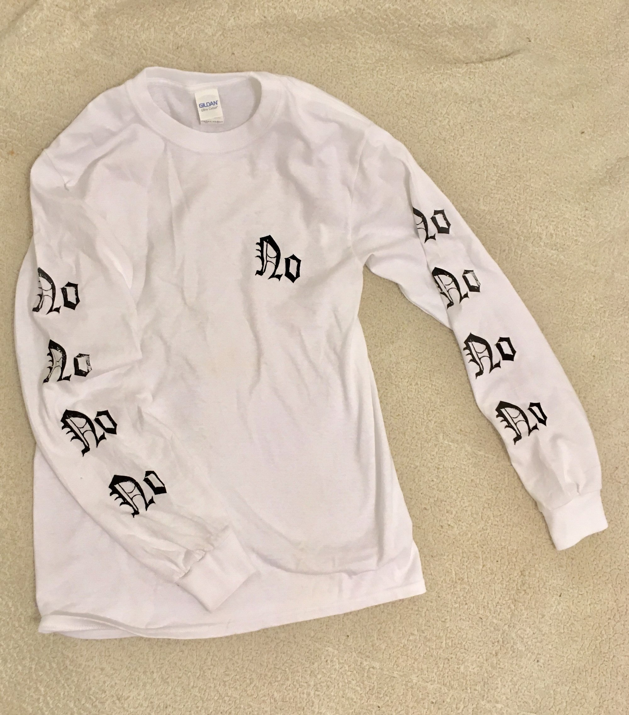 Screenprinted streetwear in black water-based ink at House of Eight Legs print shop in St. Louis. Four Old English NO’s on each sleeve and one on left chest. Each NO on the sleeve stack is derived from a unique print of my original rubber stamp. On unisex Gildan white cotton. Sizes S-XL, quantities limited.